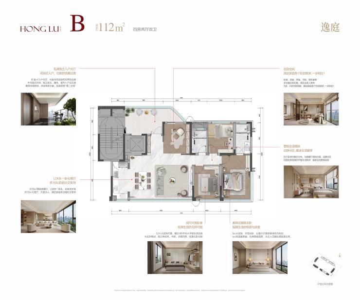 核心优势:一梯一户、纯板式、南北通透、百米楼间距、高赠送。