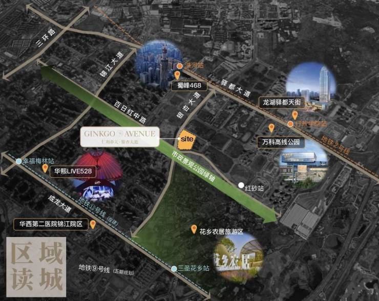 锦江大道3.5环线,成都东南,新兴五大居住板块。三圣乡以其优渥自然资源,成为真正高端生态宜居区。三圣乡区域内,以成龙大道为界,三圣乡(东区)依托东部景观带+花乡农居为中心,成为东门置业热门热点。项目则位于板块中心位置,享城市黄金配套、揽稀缺生态景观。