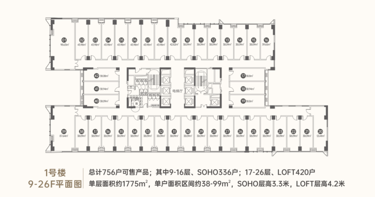 ▫️ 1#楼办公物业情况:建筑面积约42257.46㎡,总计1000户,其中LOFT420户,SOHO580户。