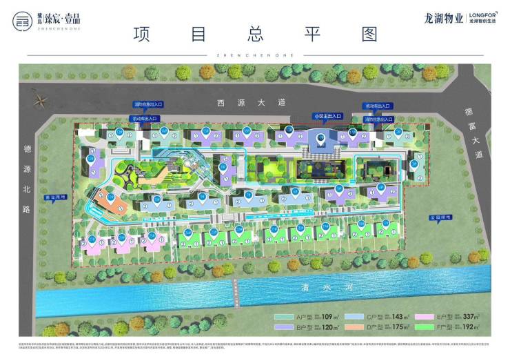 绿地率:30% 物业公司:龙湖物业 物业费:2.5元/m 产品:14-17层洋房.上下叠拼 面积:109/120/143/175/192/337