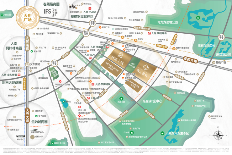 锦江大道3.5环线之上,串联金融城-潘家沟-白鹭湾-三圣乡-东部新城中心,新兴五大居住板块。集世界级政策导向、高端产业、公园生态、前沿规划和高端住宅基因于一体,撑起成都楼市的价值天花板,代表成都生活的至高水准。