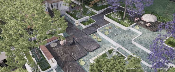 约350 ㎡三段式水景复原了莫奈的艺术巅峰作品《睡莲》,构建出一幅关于主城安逸生活的“立体画卷”。