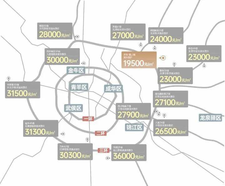 以天府广场为起点,天府大道之于城南,北星大道之于城北,日月大道、双楠大道之于城西,都以主干道+地铁的形式串联成都多个高质居住板块。而透视成都城市发展,主轴的延伸为城市发展提供外拓空间,与环线交汇处成为居住价值高地。