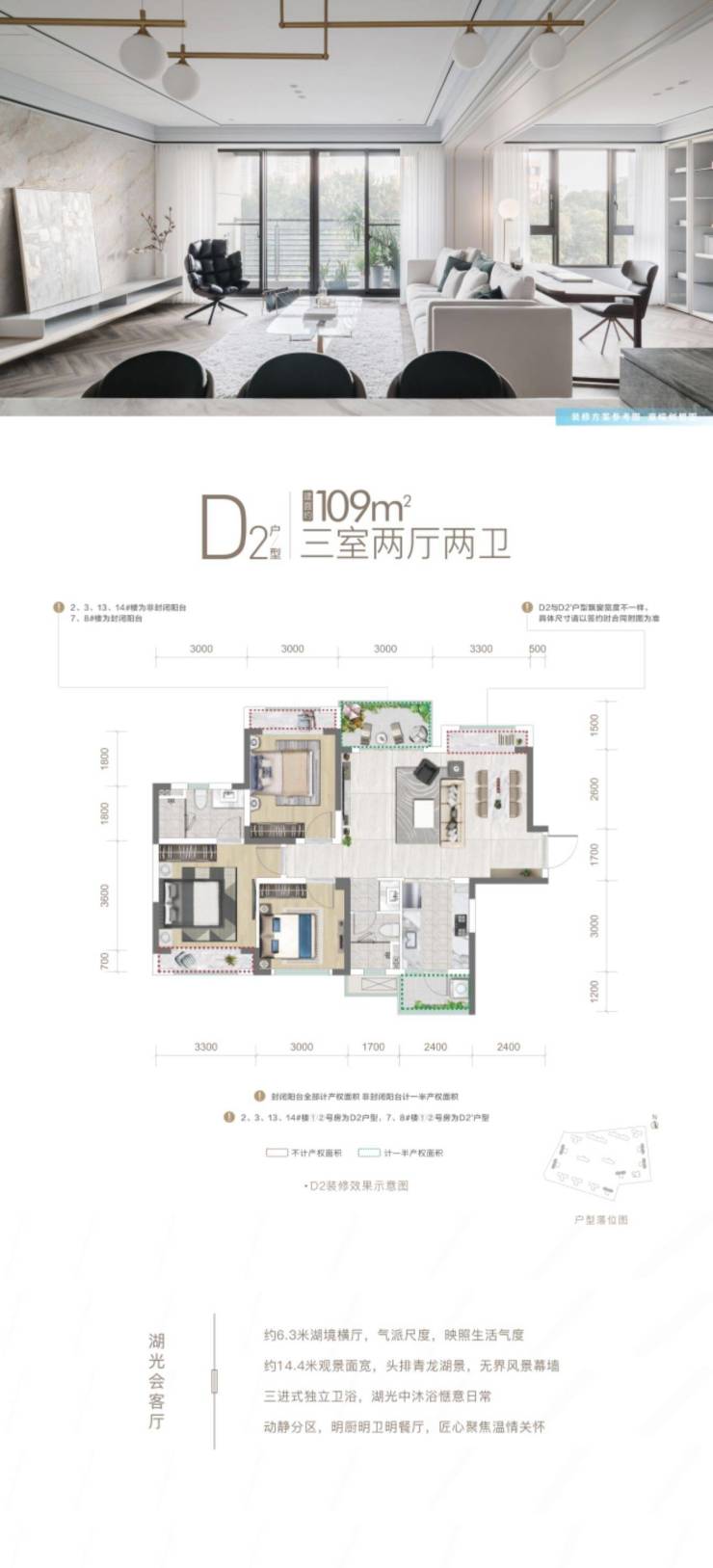 除了要求配建的小户型外,其余产品均是2T2、2T3,改善品质一览无余。