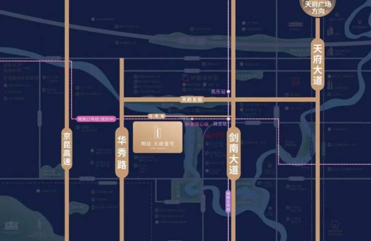 而且明信·天府壹号是目前区域在售楼盘中,距离天府五街最近的叠墅项目,直线距离约1.2公里左右(距高德地图)。从紧邻的元秀路出发,一条直路,大约2.5公里就可以到达剑南大道。对于在城南上班的朋友来说,可以说是非常便捷。