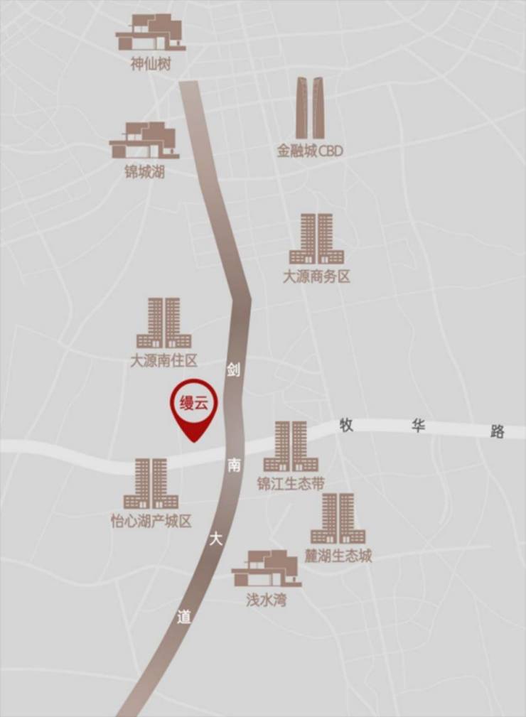 神仙树、金融城CBD、锦城湖、大源商务区、大源南住区、锦江生态带、怡心湖产城区、浅水湾等成都壕宅住区,因剑南大道而串联