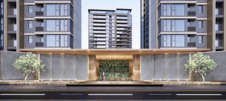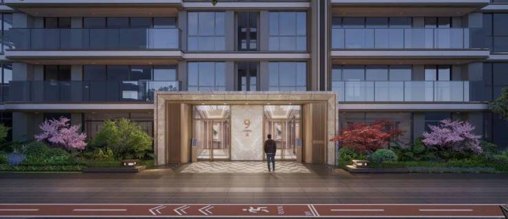 项目主入口大门采用了爱马仕灰石材点缀普拉达绿奢石以及香槟金铝板、配合水景和冬青,打造了一座宽约55米的恢弘门仪景观,从社区入口即为业主营造尊重感;通过大门后还设置了一条门廊,定制了特色帷幔、壁灯及梦幻的星空顶,沿途布置的水景及定制雕塑,增加了归家的仪式感,在单元大堂两侧,搭配花境小景,感受四季变换。