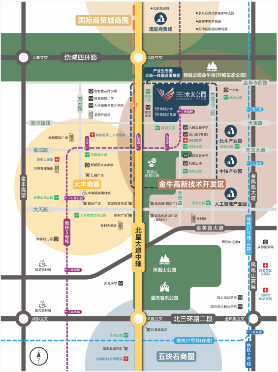 三纵:天府大道北延线(北星大道)、金芙蓉大道、蓉都大道。