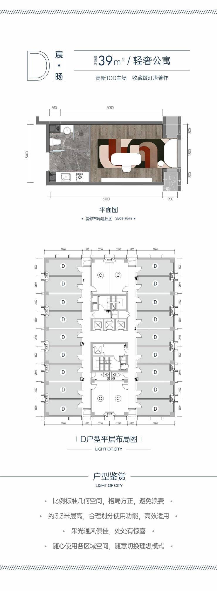 基础参数 :面积:39㎡-43㎡,3.3米平层单价:10000-11000套一,4.2米loft单价: 11500-12800套二,轻奢大平层单价:待定,梯户比:4T22户,物业费:3.9元/平,水电气:通水电(轻奢三通),公摊:30%,装修情况:清水,交房时间: 2024年12月