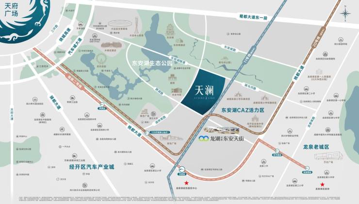 项目北揽5000亩东安湖生态,南拥龙泉驿区约20万方最大商业 综合体——龙湖东安天街+吾悦广场,兼具静谧生态与繁华商圈,汇聚东安湖最好的配套资源