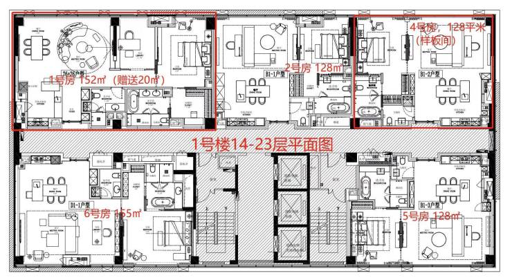 梯户比:1#楼28层 低区3-13F三梯6户/中区14-23F三梯5户/高区24-28F三梯4户