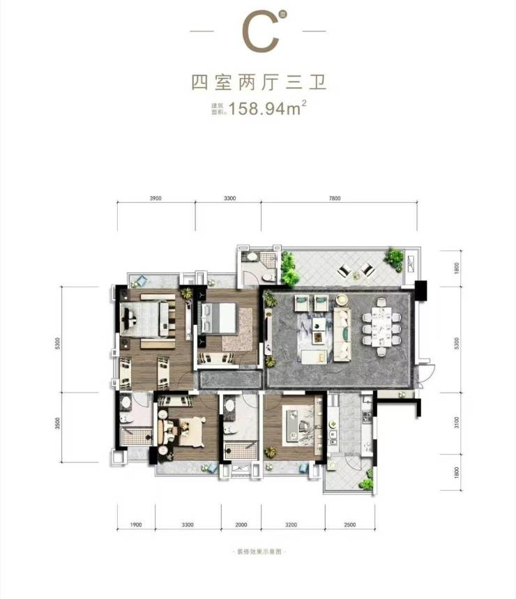 面积160㎡左右套四三卫、双主卧设计,港式大横厅,客厅长7.8m,宽5.3m,横厅设计,并连带约7m长*宽1.8m的观景阳台,大尺度厅堂超越平凡