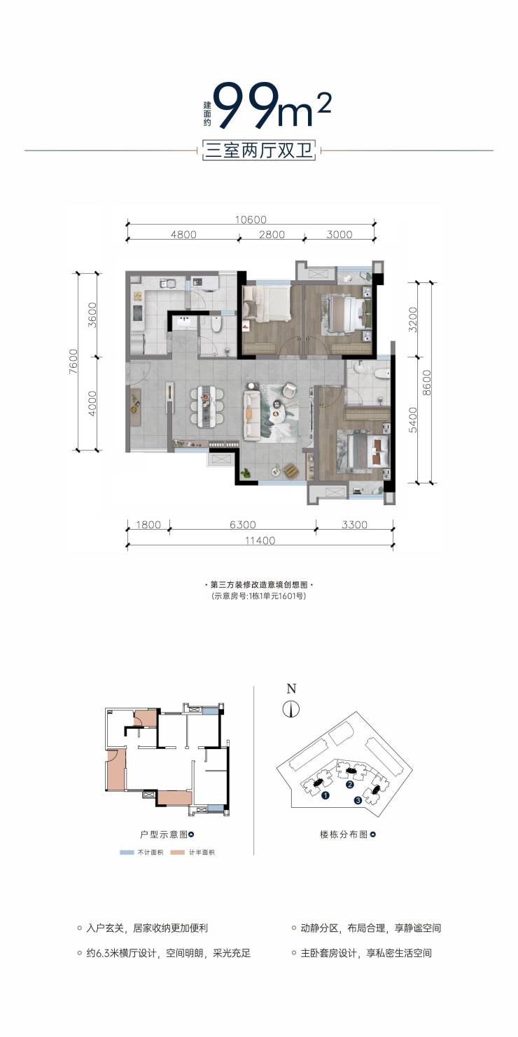 整体规划采用半围合式布局,约5000㎡中庭园林景观,享超大楼间距,互不遮