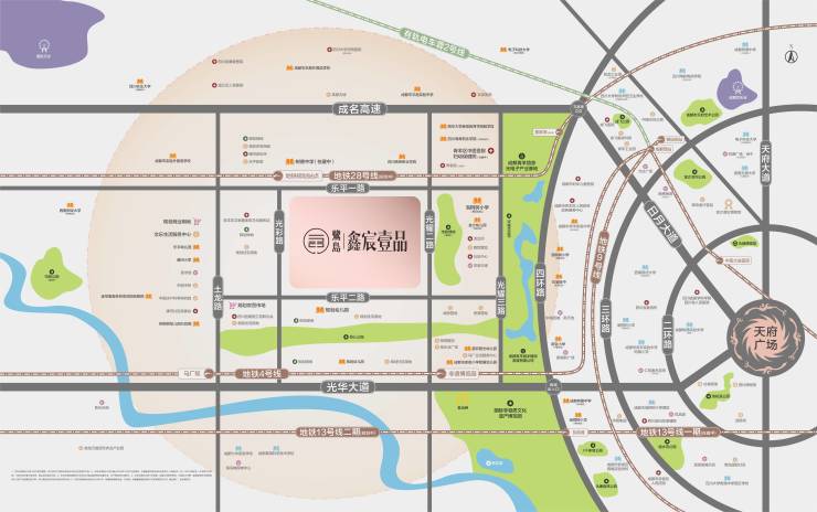 主城枢纽:4号线非遗站、规划中的28号线,三条主干道土龙路、光华大道、绕城高速