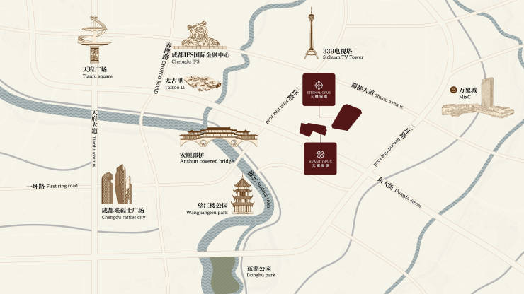 国贸地产双子所立之处,成都3000年永恒的繁华贵地,东大街一脉承续千年商脉与交子金融基因,集历史底蕴、金融核心、时尚封面与高端住区于一体,居住与收藏价值兼备。