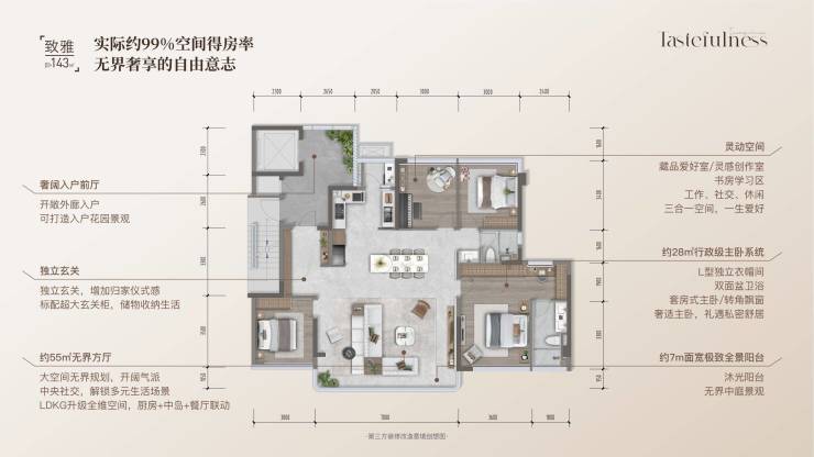 项目占地约39亩,容积率仅1.8,绿地率30%,住宅占比80%,商业占比20%,住宅总计236户。规划了2栋商业别墅,6栋17—25F的住宅,2梯2户,面积段在143m²-182m²,改善属性纯粹。