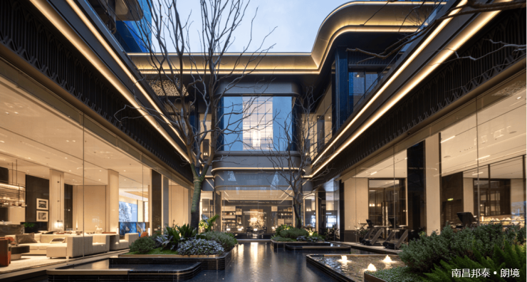 中庭核心景观:保留大面积的中央庭院水景,形成层次丰富的互动空间,将园林景观体验最大化。