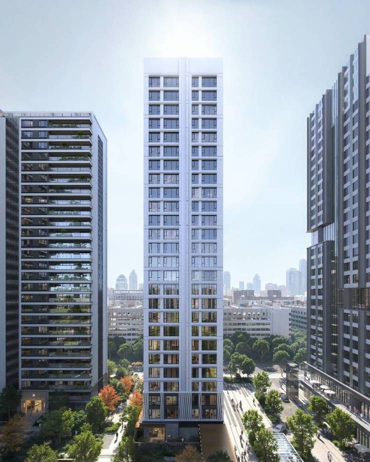 汲取全球地标建筑的立面营造理念,采用米白色、深灰色的颜色打造现代轻奢的高级灰风格,天际光幕外立面,两层挑空入户大堂使用石材、格栅、铝板打造,户内断桥铝LOW-E玻璃和玻璃栏板打造类公建化立面,亮相即是桐梓林颜值地标。