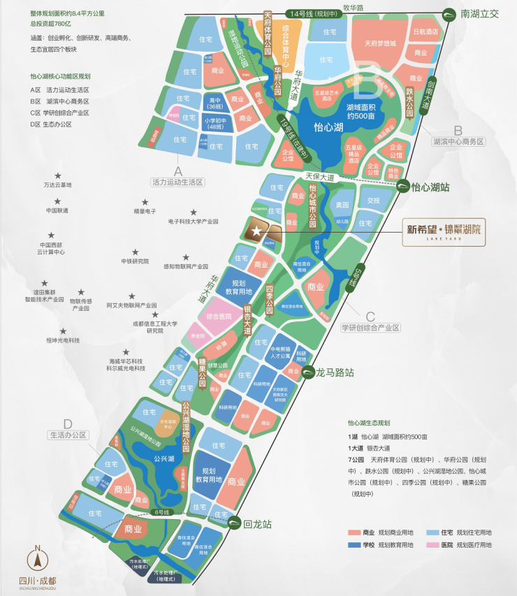 商业休闲:成都第三座银泰、中国西南首家-日航酒店(在建中)、蔚蓝文化艺术中心(在建中)、阿丽拉酒店(规划中)、凯悦尚萃酒店(规划中)、湖畔书店-怡所(在建中)等