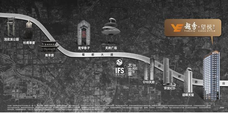 1、蜀都大道-城市壕宅走廊:以天府广场为中心点,向西串联着少城、浣花溪、金沙三大官邸壕宅的基因,每一座影响成都三千年的地标壕宅皆出自于此,向东一脉传承,串联现代成都壕宅城市地标-太古里/东大路的D10、仁恒滨河湾、迎晖天玺。