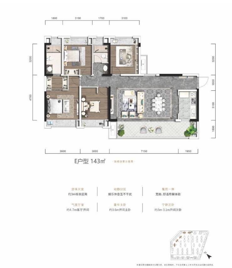 143㎡套四,3米标准层高,动静分区,约4.7米客厅开间,约3.6米开间主卧。