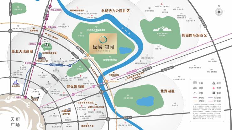 熊猫路小学、熊猫路中学、石室中学、成都七中英才学校、成都嘉祥外国语学校等多龄段教育资源;未来区域内两公里范围内还将开建6所幼儿园,2所小学,1所中学 ,以全龄段教育配套构筑主城教育高地。