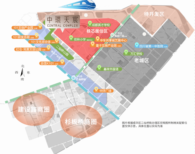 根据2017年提出的“中优”战略,成都规划有「两中七副」九大中心:主城三环内只有两个发展中心,一个是天府锦城中心、另外一个就是项目所处的八里庄副中心。