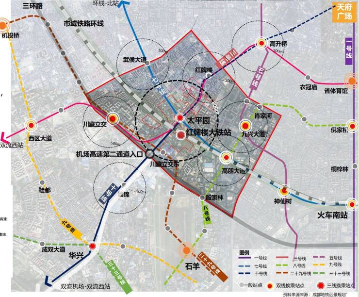 太平园片区是是三国创意园产业功能区之一(https://mp.weixin.qq.com/s/KYpinbw_-R67-hMeYegpIg)太平园TOD项目设计研究范围达12平方公里,占地面积约1293亩,整体规划为一芯两轴两廊四片,一芯为太平园TOD核心,汇聚 3、7、10三条地铁交汇,贯穿全城的轨道交通枢纽区域,太平园TOD是成都市目前仅有的5个“三线换乘”TOD,还规划了主城第三座城市候机楼,未来将会成为成都主城的西南门户。