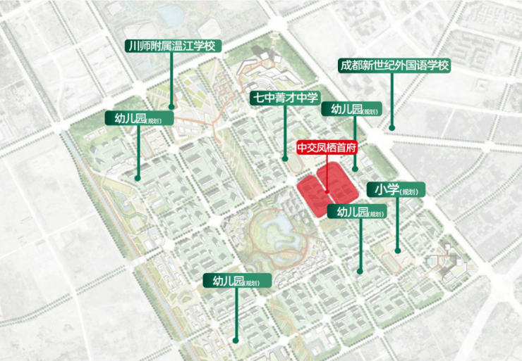 片区已落地了川师附属温江实验学校和成都市温江区菁才中学校。其中,川师附属温江实验学校是由四川师范大学领办的公办九年一贯制学校,学校共规划54个班,已经建成,小学与初中计划9月开学。成都市温江区菁才中学校由成都七中领办(项目正对面),现已开工建设,将于2025年8月正式开校。成都七中和川师附,两大“品牌”教育资源加持,凤栖湖的教育配套几乎处于同圈层中的第一梯队。
