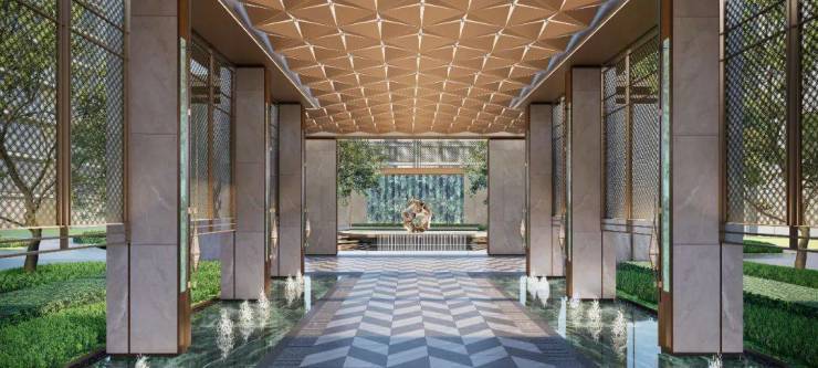 项目主入口大门采用了爱马仕灰石材点缀普拉达绿奢石以及香槟金铝板、配合水景和冬青,打造了一座宽约55米的恢弘门仪景观,从社区入口即为业主营造尊重感;通过大门后还设置了一条门廊,定制了特色帷幔、壁灯及梦幻的星空顶,沿途布置的水景及定制雕塑,增加了归家的仪式感,在单元大堂两侧,搭配花境小景,感受四季变换。