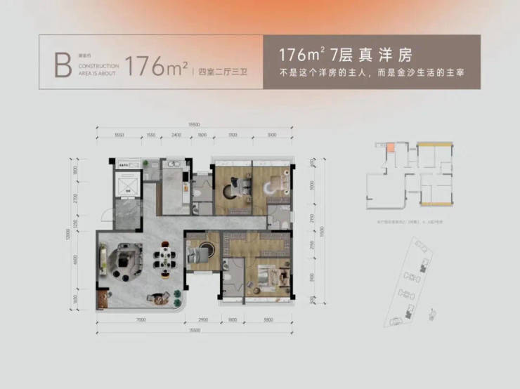 纯住宅属性,全2T2户板式户型,甚至还给到了内金沙新房市场中近乎绝版的两栋7F洋房。