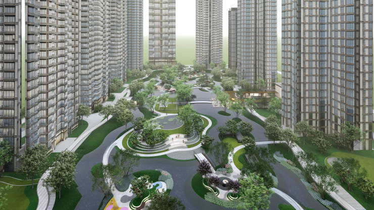 项目分三个地块打造,3号地块为商业综合体,2号地块为市政公园(2865㎡),1号地块为纯住宅用地,占地86亩,容积率2.5,绿地率58%,建筑密度仅10%,整体采用围合式布局,中庭约4.3万方,楼间距最高达240m;