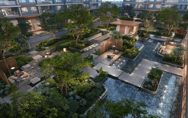 园林采用“两轴六园九奁”布局,打造约1.5万㎡南北双中庭园林。