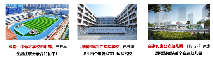 一街之隔就是七中菁才学校初中部,全温江收分最高的初中;距川师附属温江实验学校直线距离仅约500米;星河自建18班公立幼儿园预计27年建成,是凤栖湖板块首个在建幼儿园;另板块内还有其余5所学校,教育资源丰富。川师附属温江实验学校、成都七中菁才学校为实景图、自建18班公立幼儿园为意向效果图