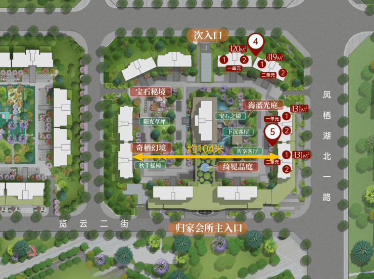 两轴:“礼序轴”与“生活轴”承载归家仪式与度假体验六大主题花园:珍宝礼庭、踏水寻宝归家、绮冕晶庭、海蓝光庭、奇栖幻境、儿童宝石秘境九奁园林节点:主入口、两侧会所、踏水寻宝归家、居家会所、下沉卡座、宝石水景、微风花园、儿童乐园以上图片为意向效果图